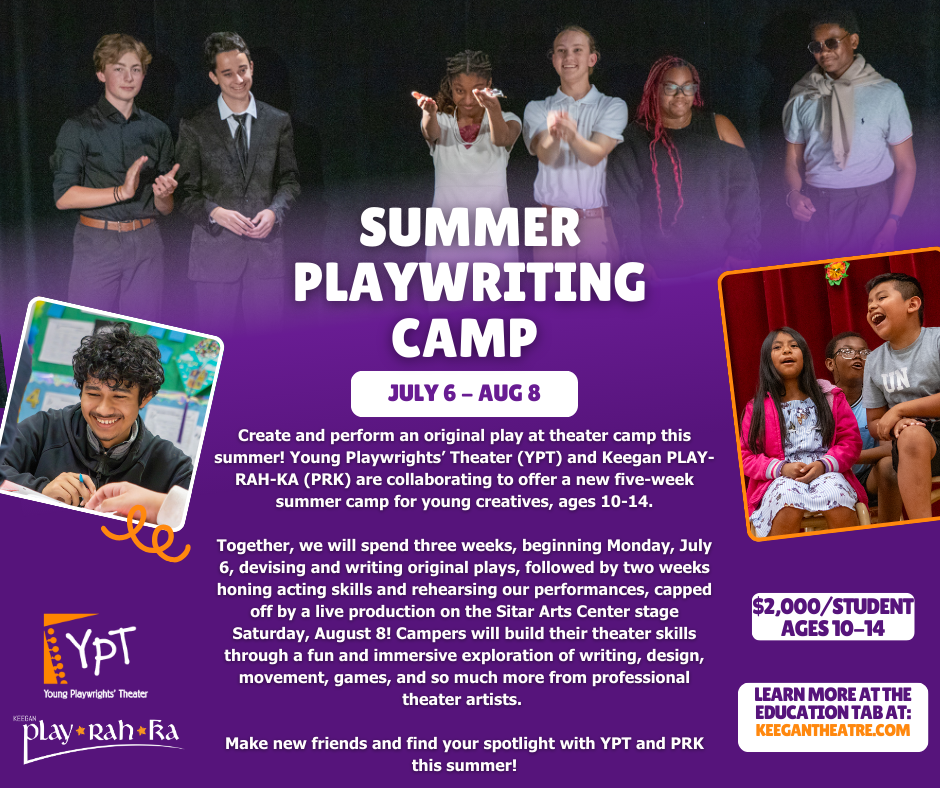 Create and perform an original play at theater camp this summer! Young Playwrights’ Theater (YPT) and Keegan PLAY-RAH-KA (PRK) are collaborating to offer a new five-week summer camp for young creatives, ages 10-14.