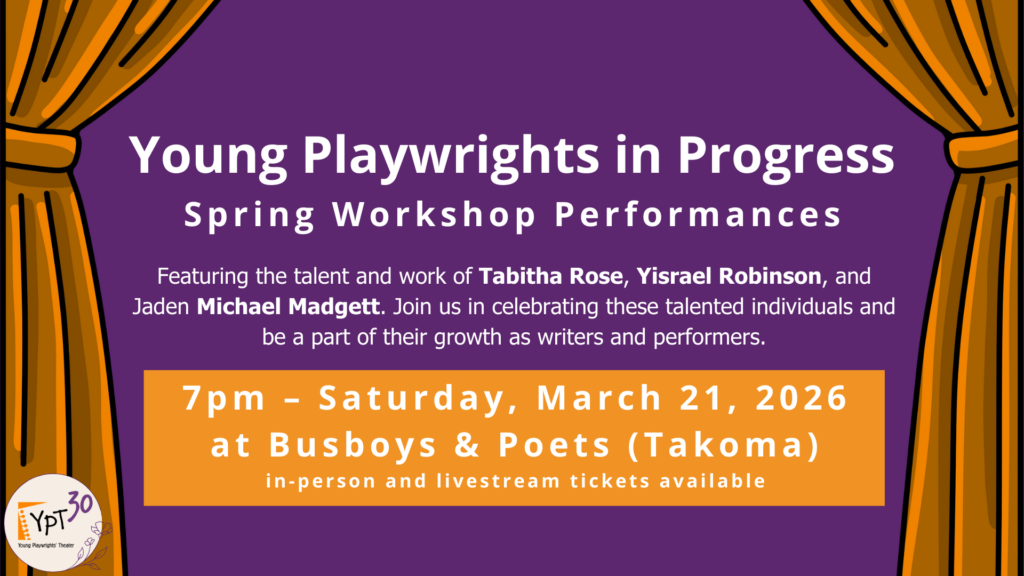 This Spring, YPT is showcasing the talent and hard work of three young playwrights with a one-night performance. Tabitha Rose, Yisrael Robinson, and Jaden Michael Madgett will each perform their original plays on the Busboys and Poets (Takoma) stage. Join us in celebrating these talented individuals and be a part of their growth as writers and performers.
